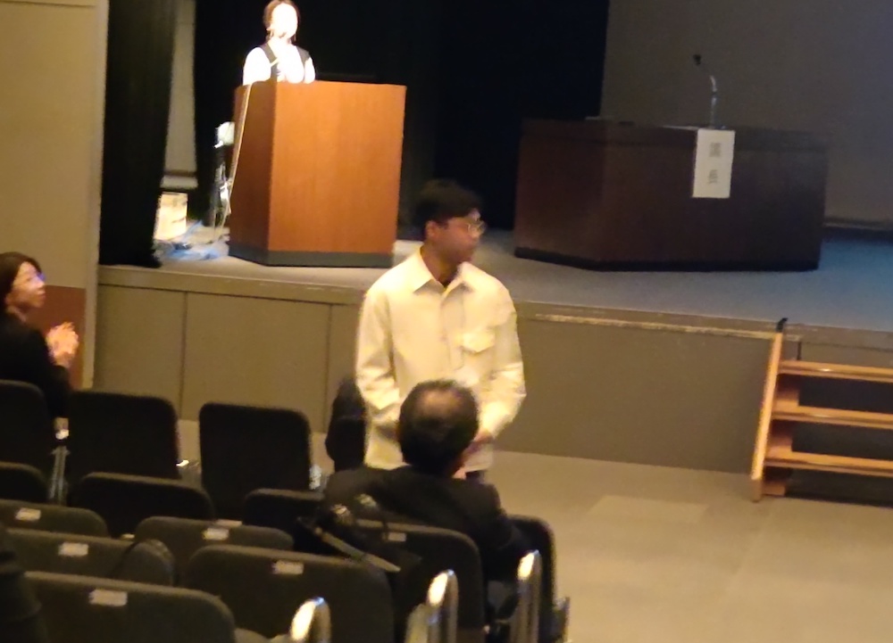 財前くんはみごとに優秀発表賞を受賞。名前を呼ばれてキョロキョロしているとこ。