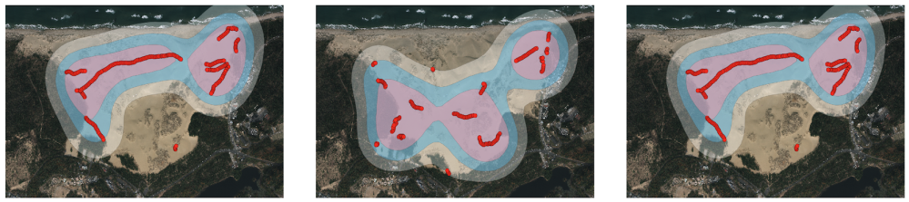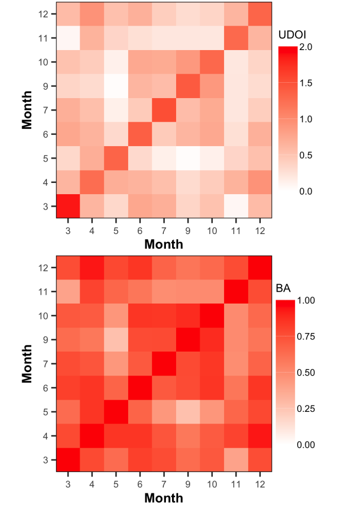 各月の分布情報を基に利用範囲を推定し、その重複具合をBA(Bhattacharyya’s Affinity)とUDOI(Utilization Distribution Overlap Index)で計算した。