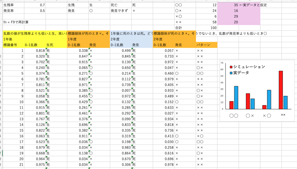 標識再捕法で生残率をどのように計算するのかについて、その原理をエクセルを使って教えてくれる。